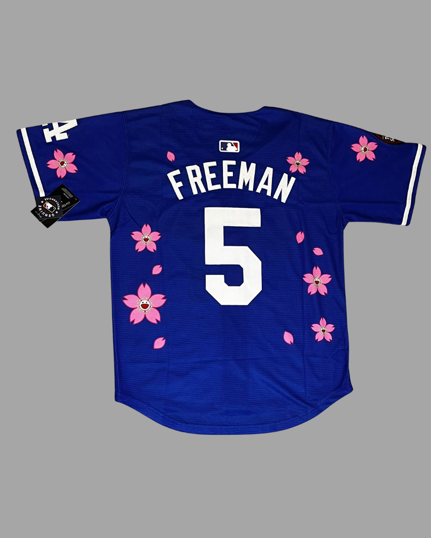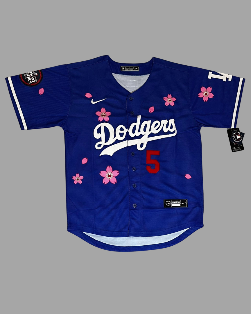 Camisa de béisbol inspirada en Los Angeles Dodgers edición Tokyo Series, diseñada en color azul con detalles de flores de cerezo.