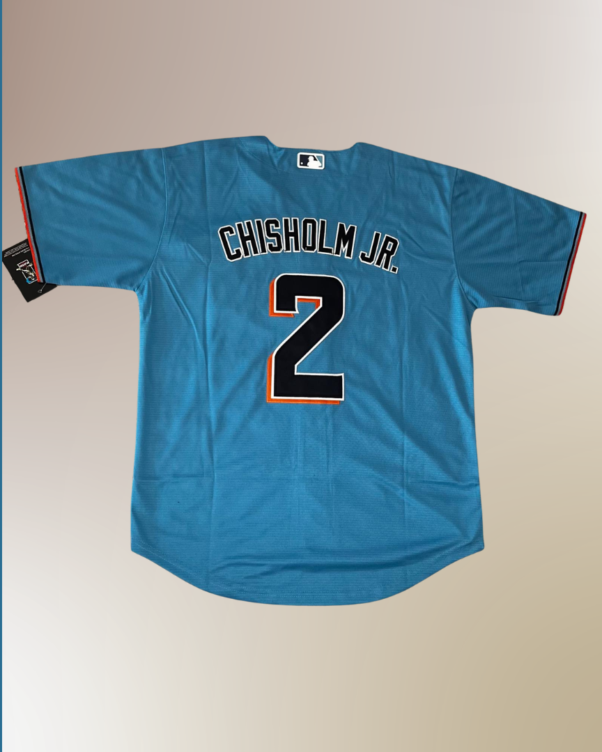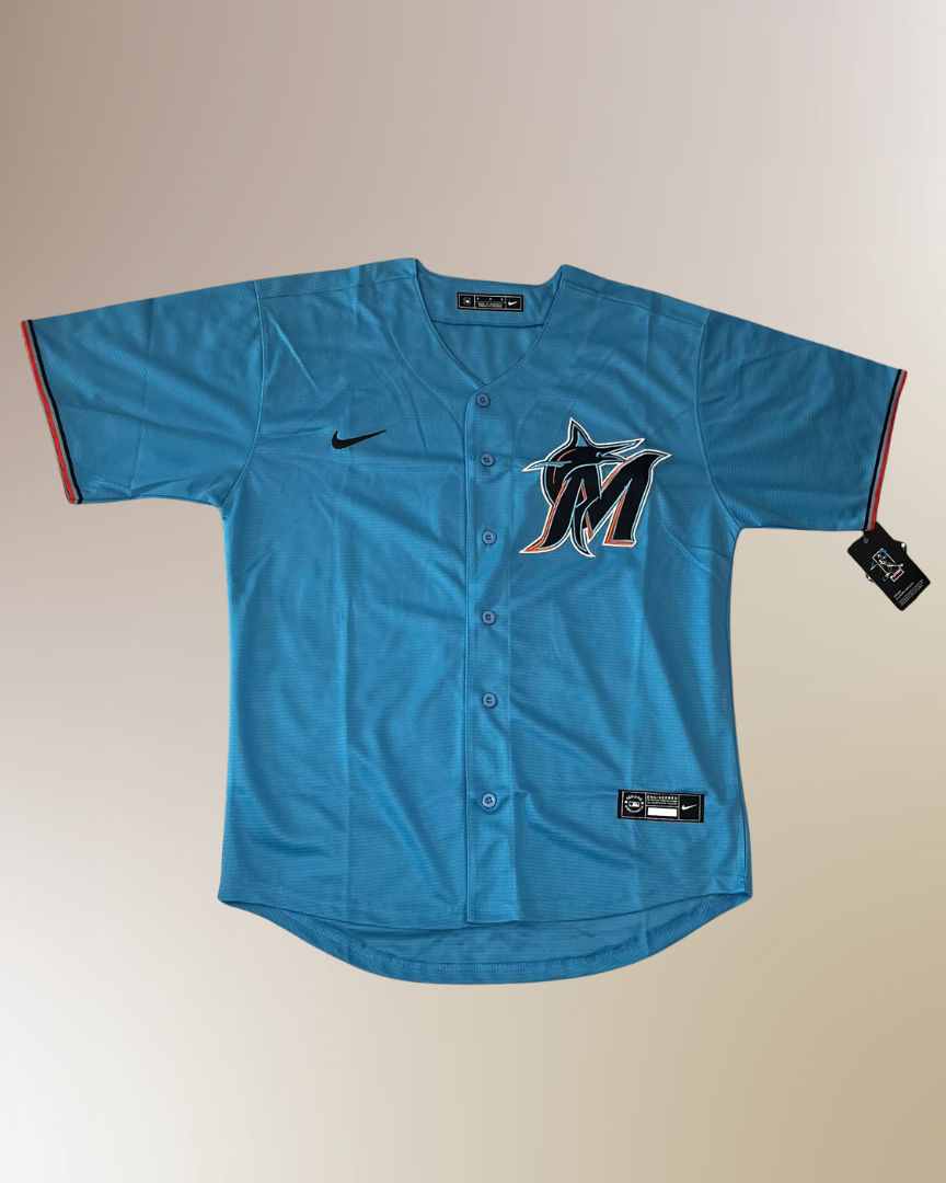 Camisa de béisbol inspirada en el equipo de Miami Marlins, diseñada en color azul con detalles deportivos clásicos.