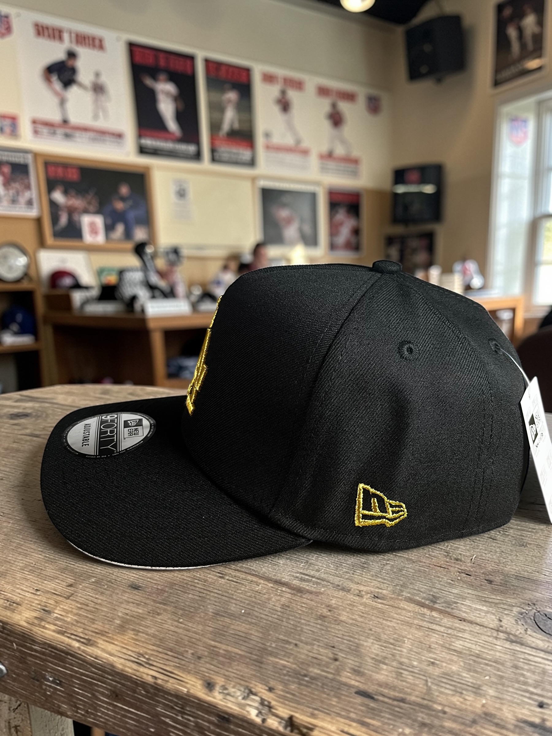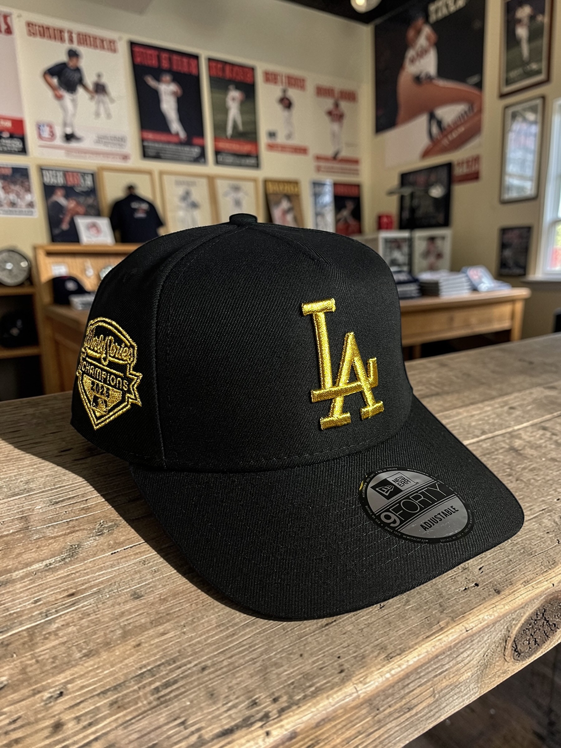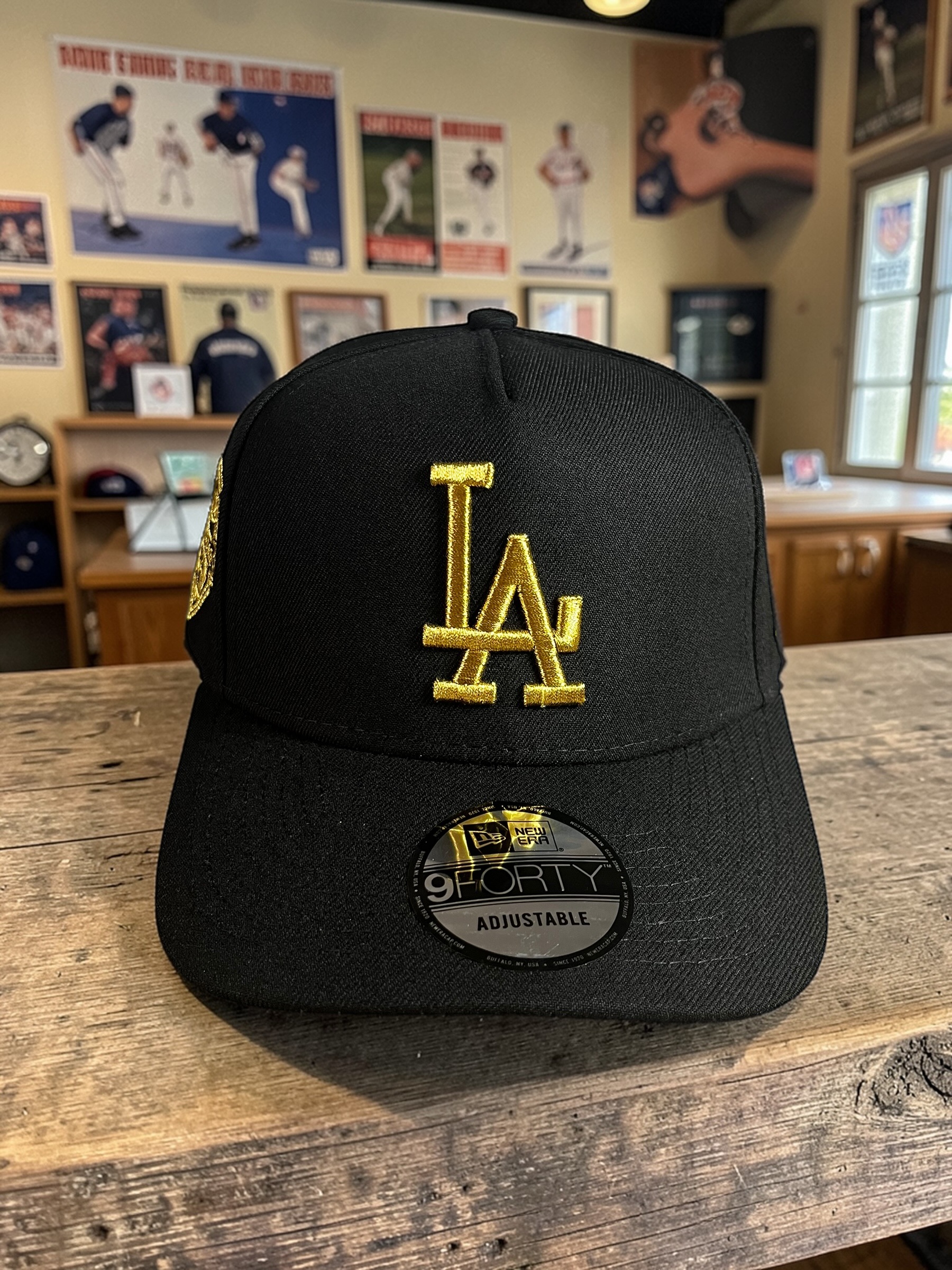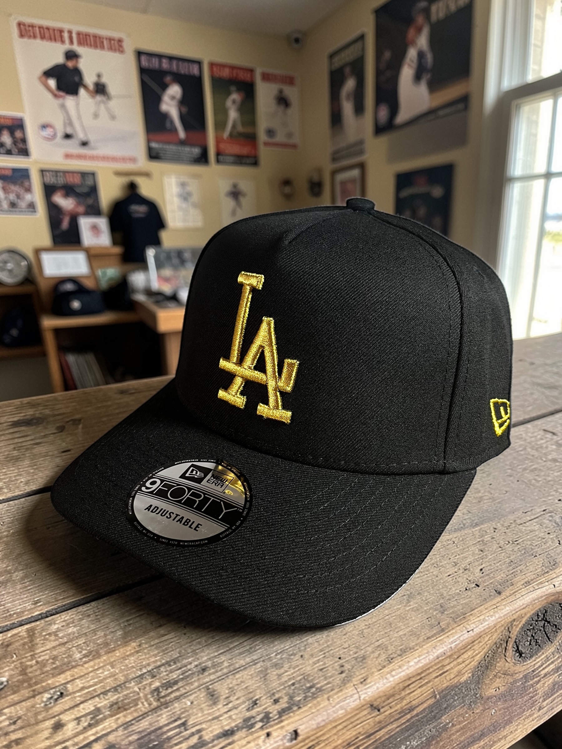 Gorra 9FORTY inspirada en Los Angeles Dodgers, diseñada en color negro con detalles dorados y contraste en la visera.