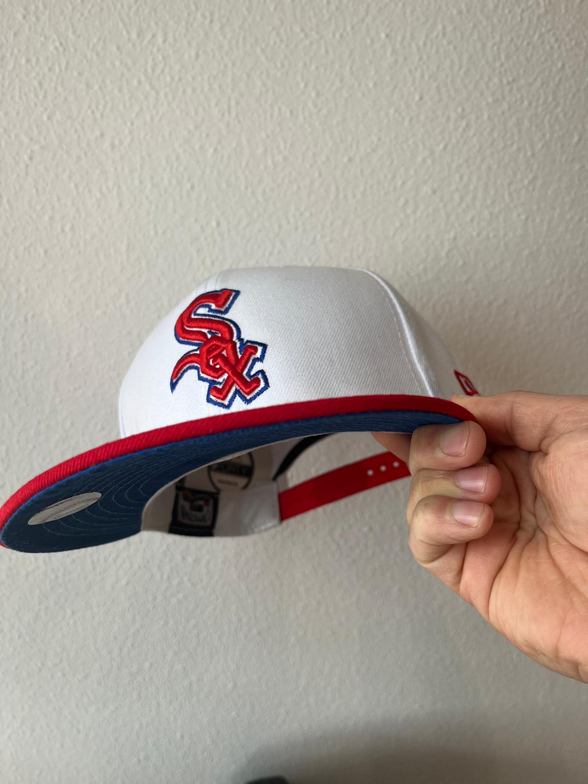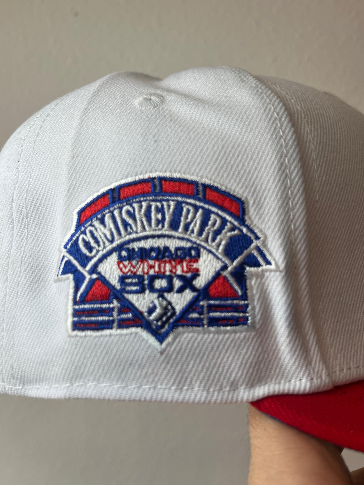 Color blanco con visera roja en la parte superior y azul en la parte inferior. Parche frontal “SOX” tejido en hilo rojo con detalles bordados en blanco y azul. Parche lateral con texto Comiskey Park Chicago White Sox. Ajustable, cómoda y con estilo urbano.