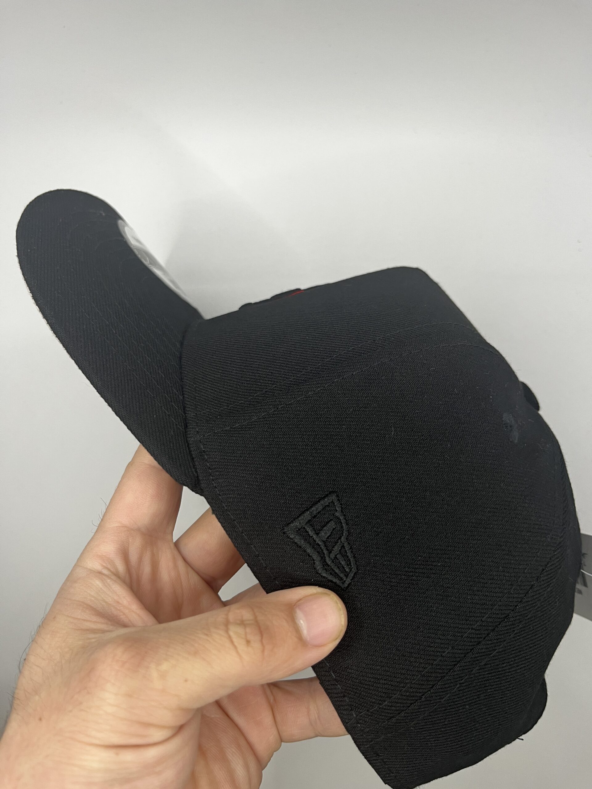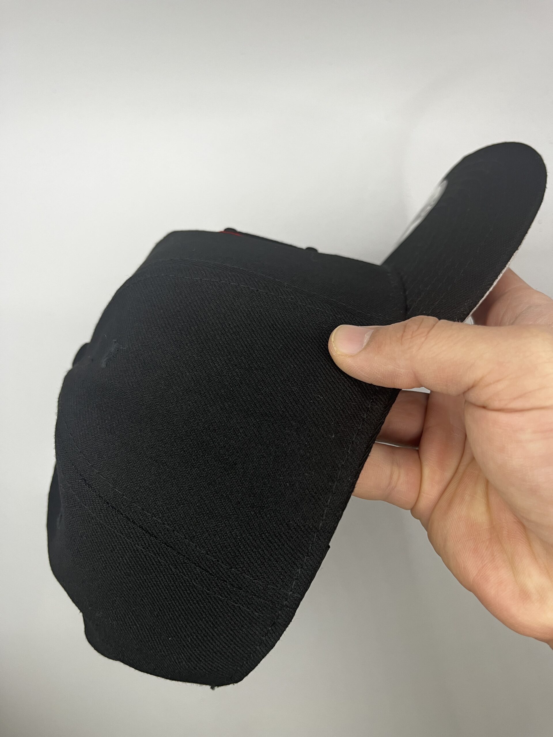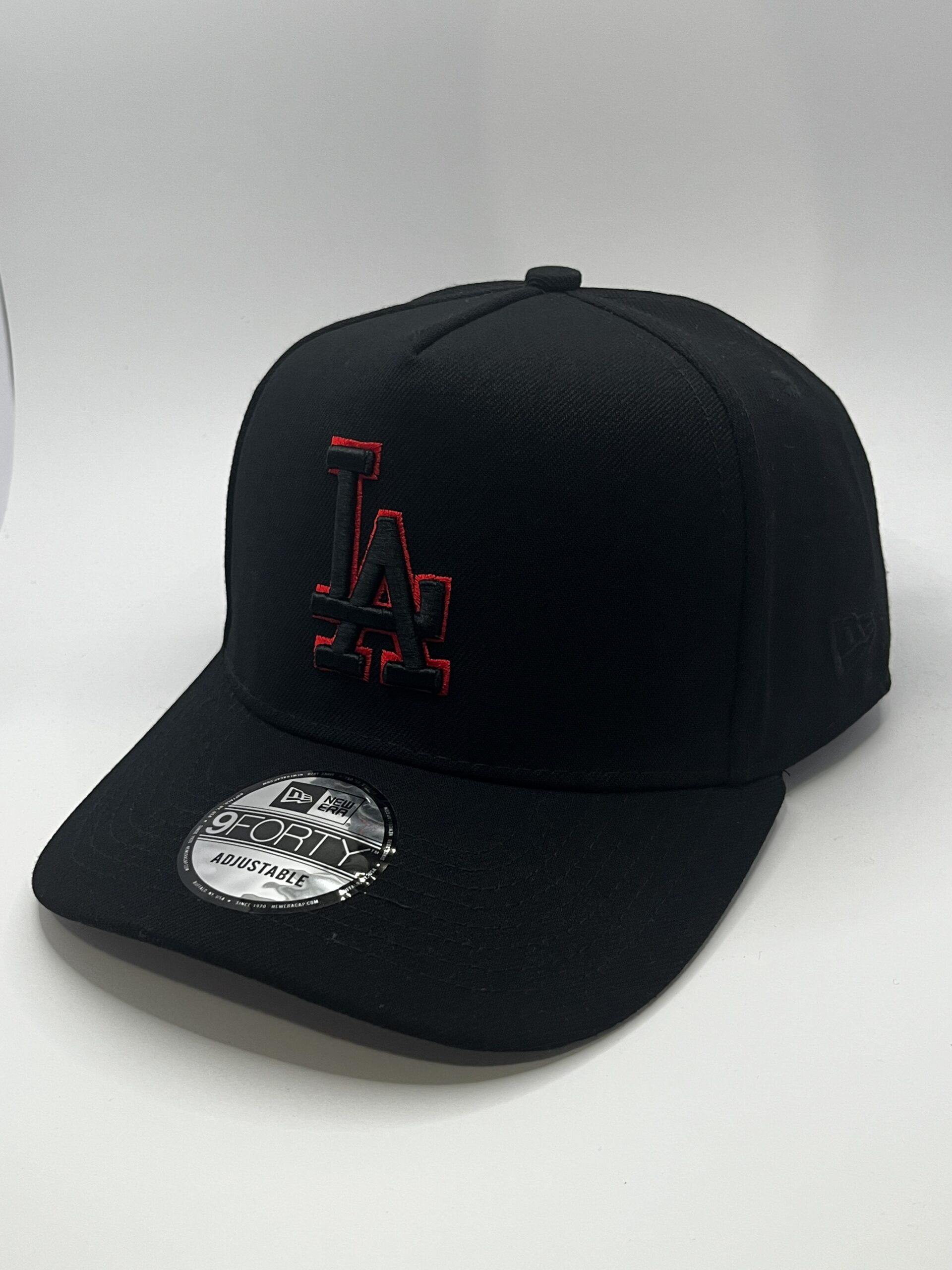 • Logo frontal: “LA” tejido en negro y bordado en rojo