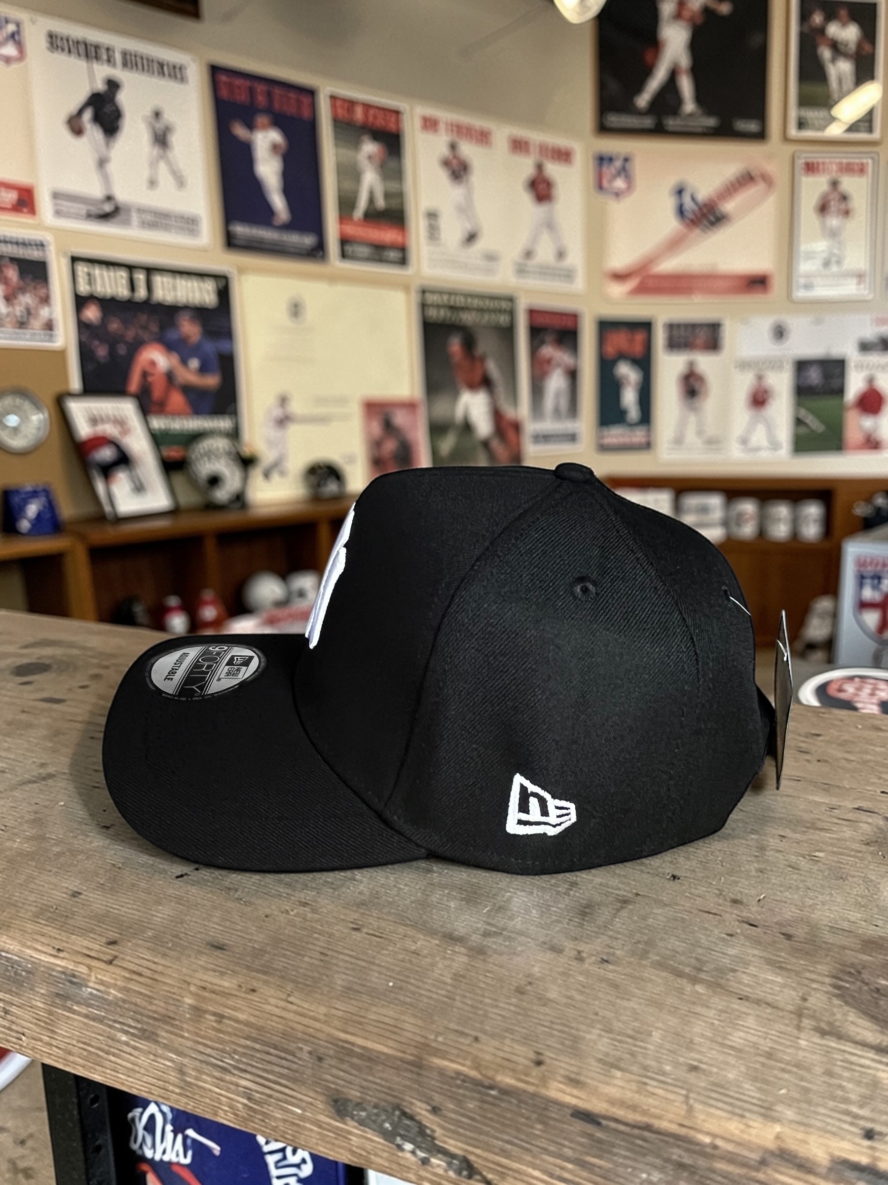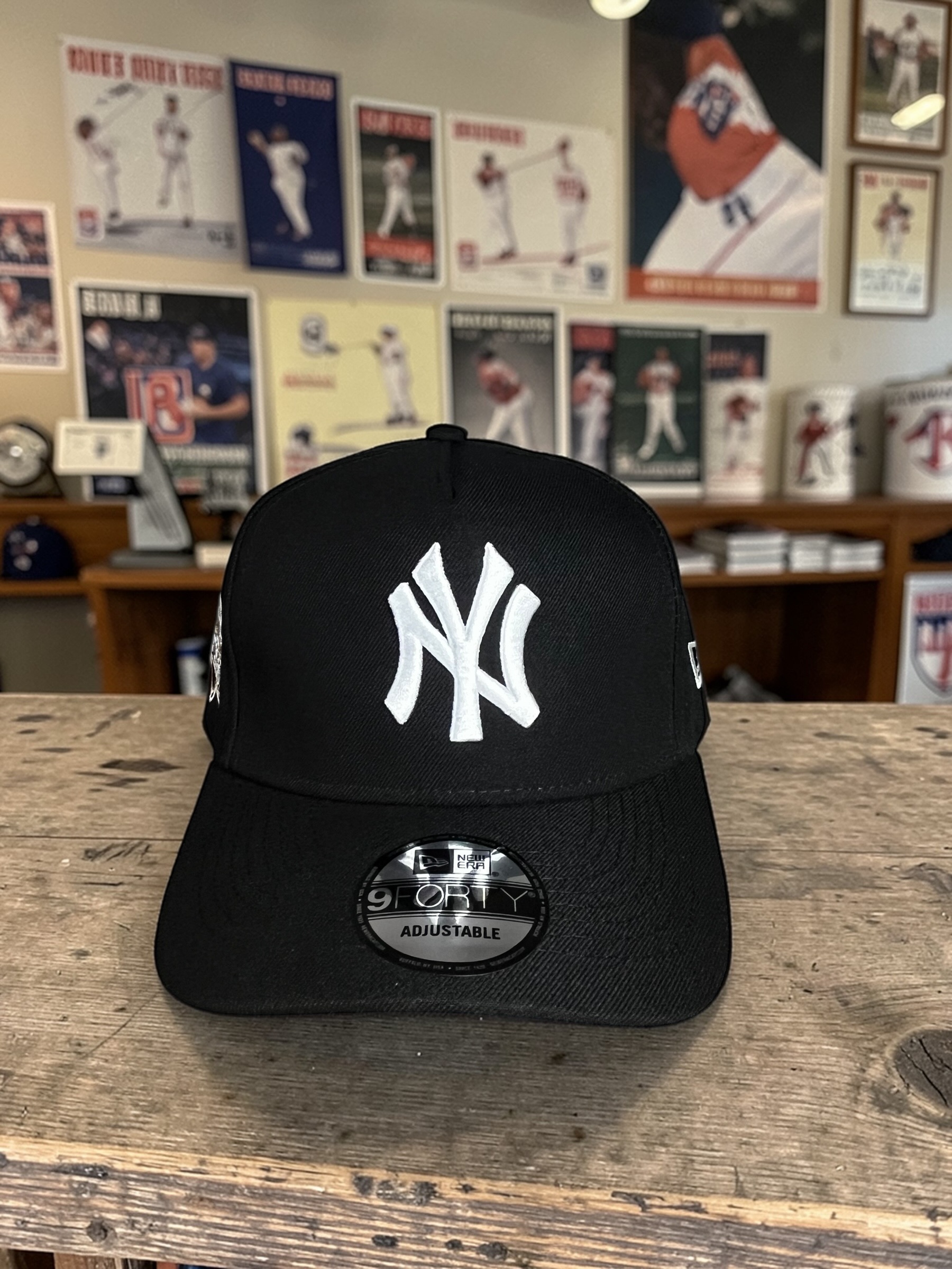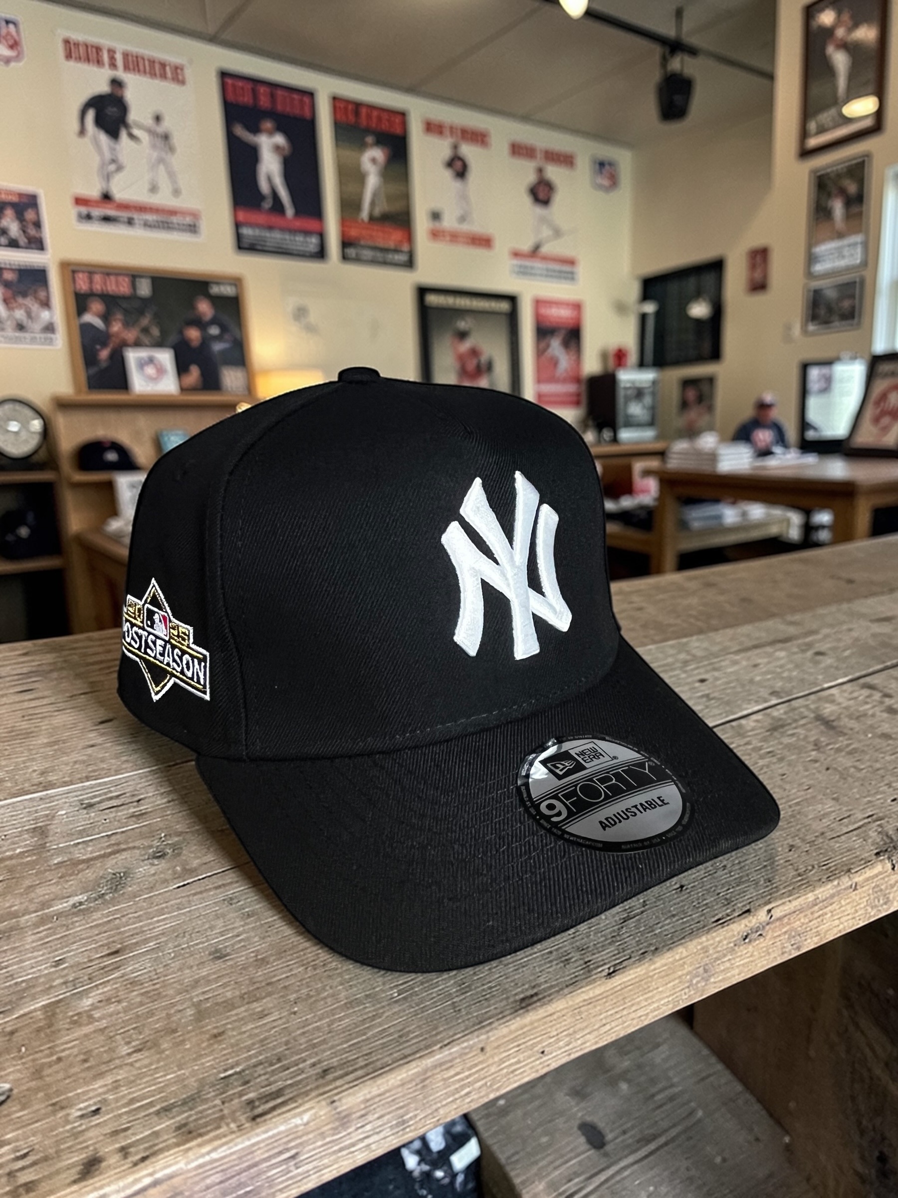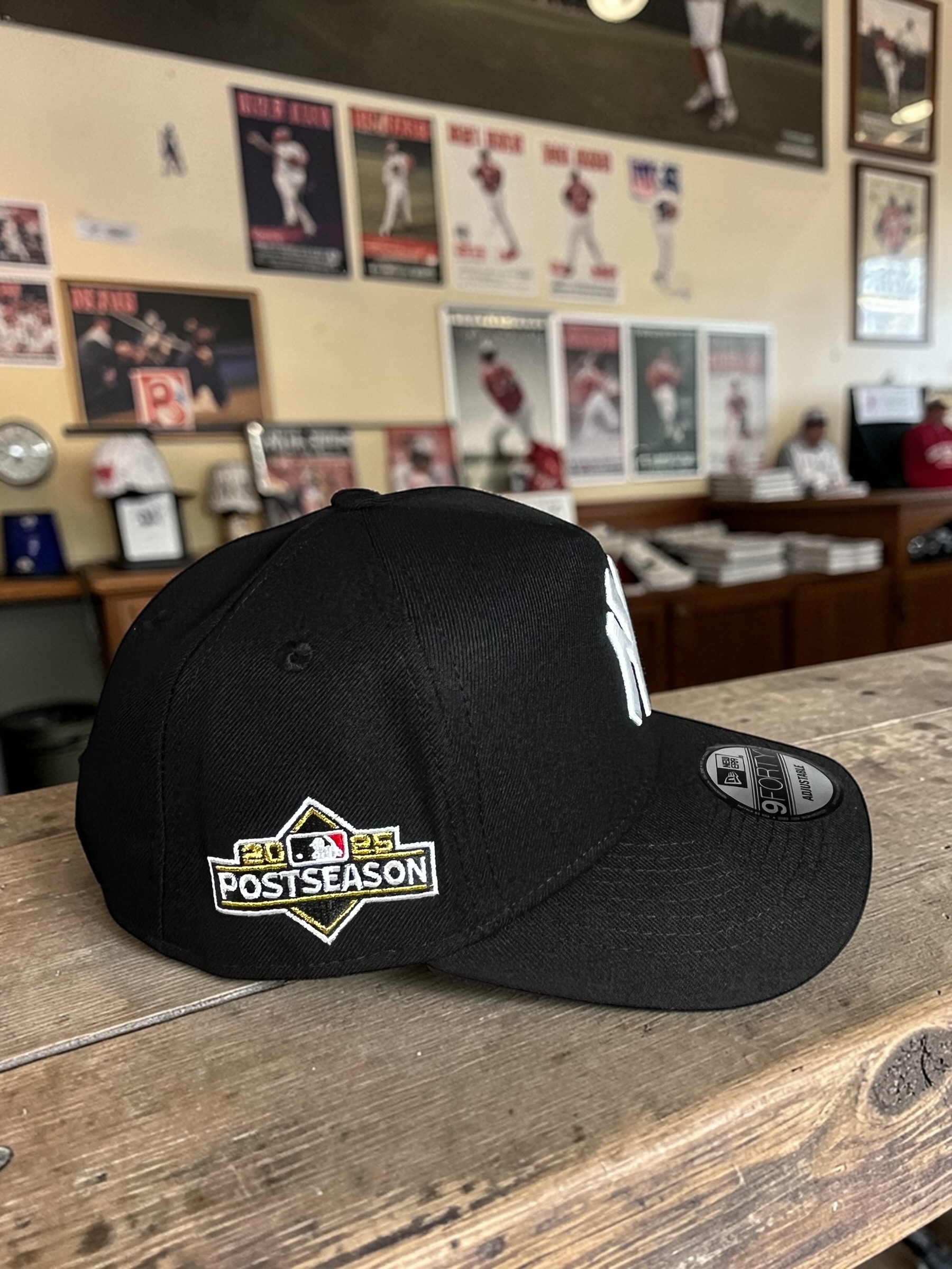 Gorra 9FORTY inspirada en New York Yankees, diseñada en color negro con detalles bordados en contraste y edición Postseason 2025.