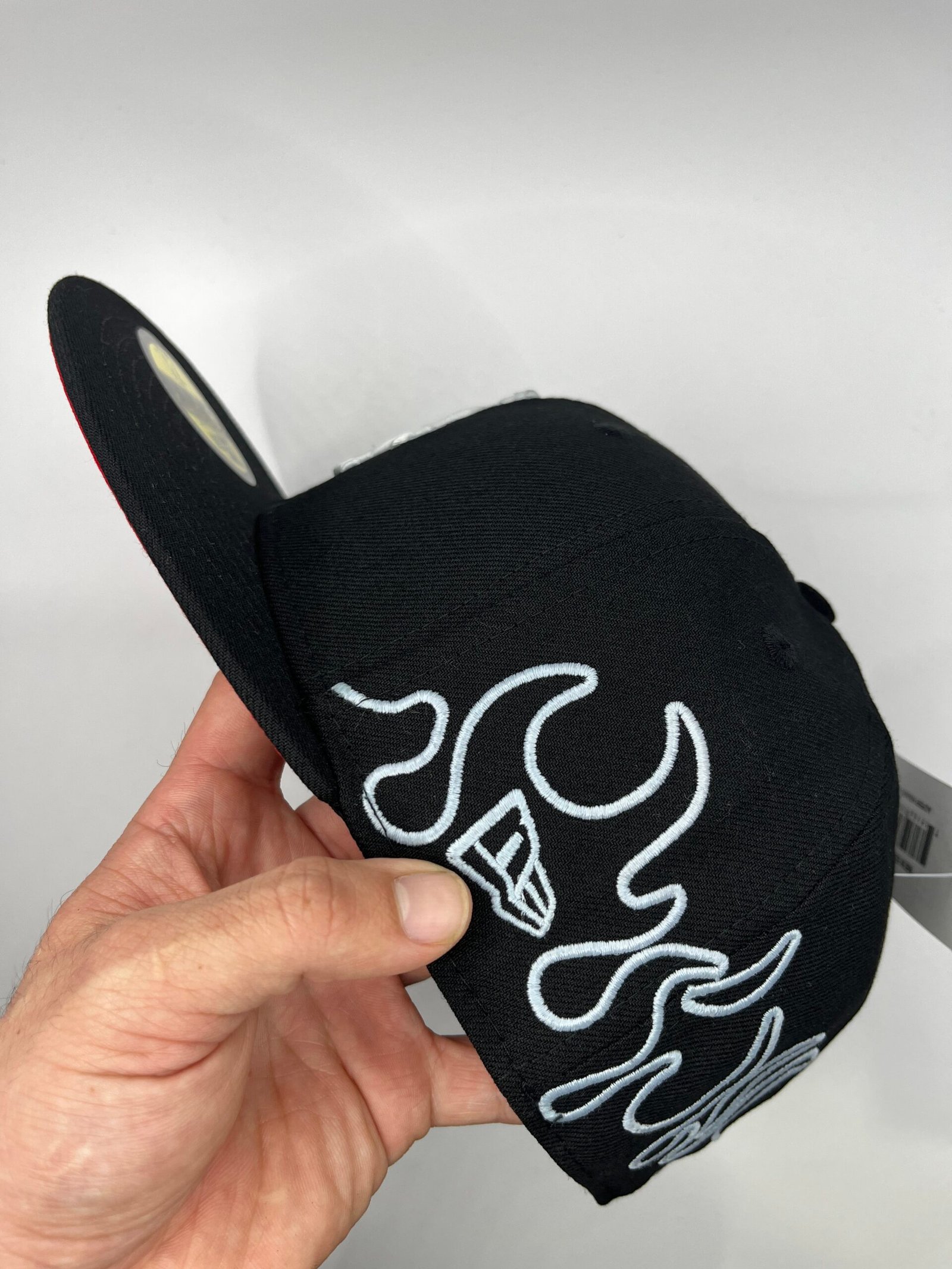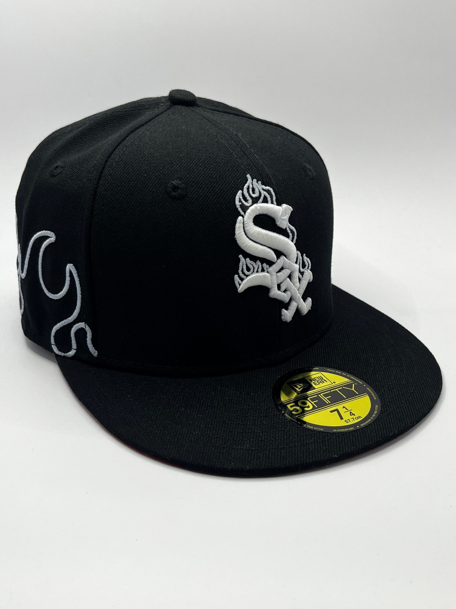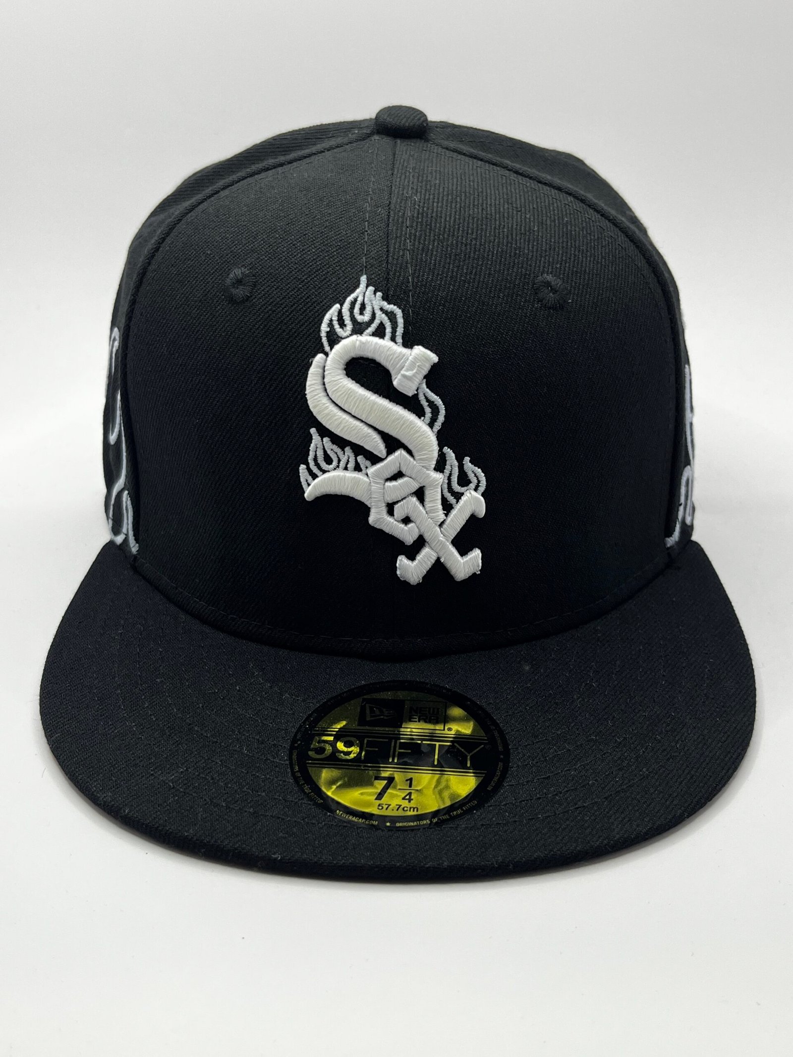 New Era 59FIFTY White Sox negra blanca con llamas y glow, talla 7 1/4 (57,7 cm), visera negra