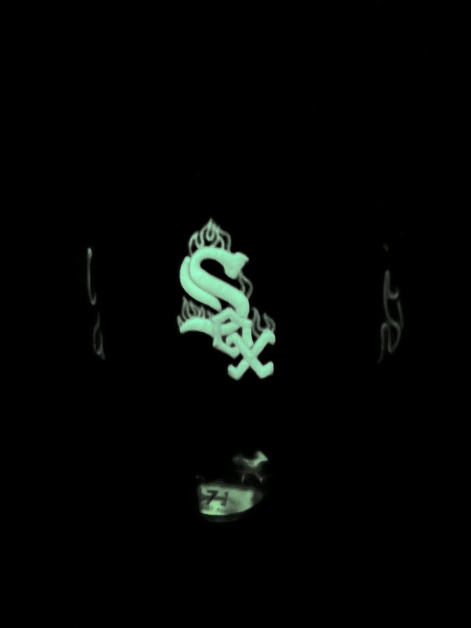 Gorra New Era modelo 59FIFTY cerrada (fitted) del equipo Chicago White Sox con diseño especial en llamas y detalles que brillan en la oscuridad.