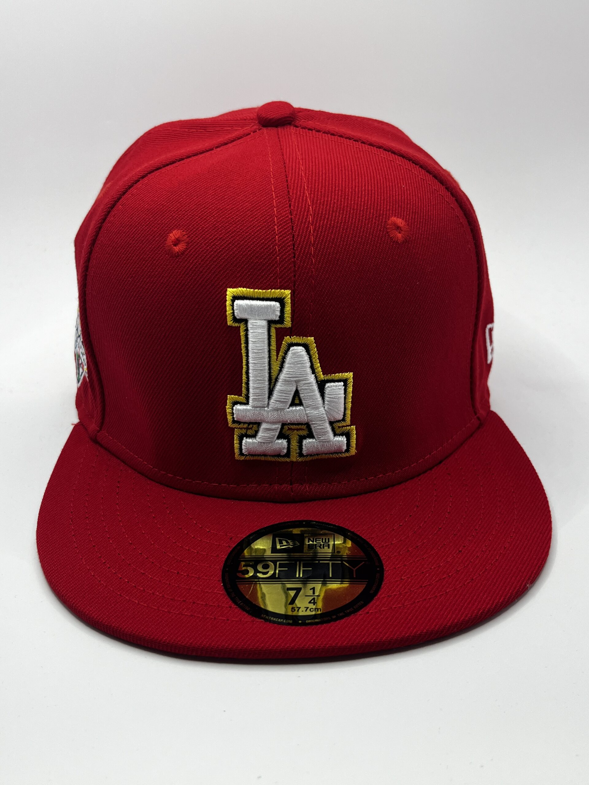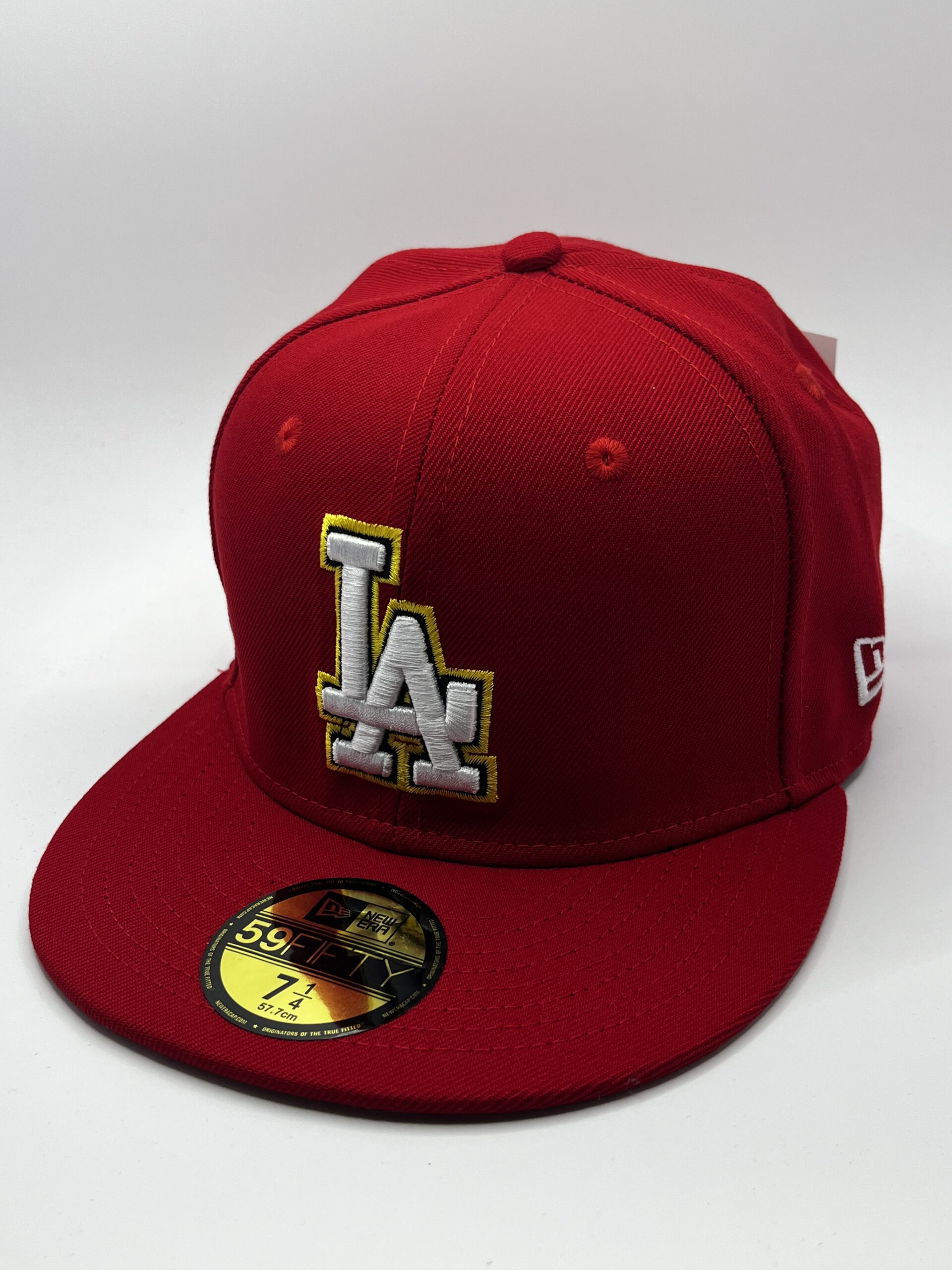 Gorra New Era modelo 59FIFTY cerrada (fitted) del equipo Los Angeles Dodgers con detalles bordados en blanco y dorado.
