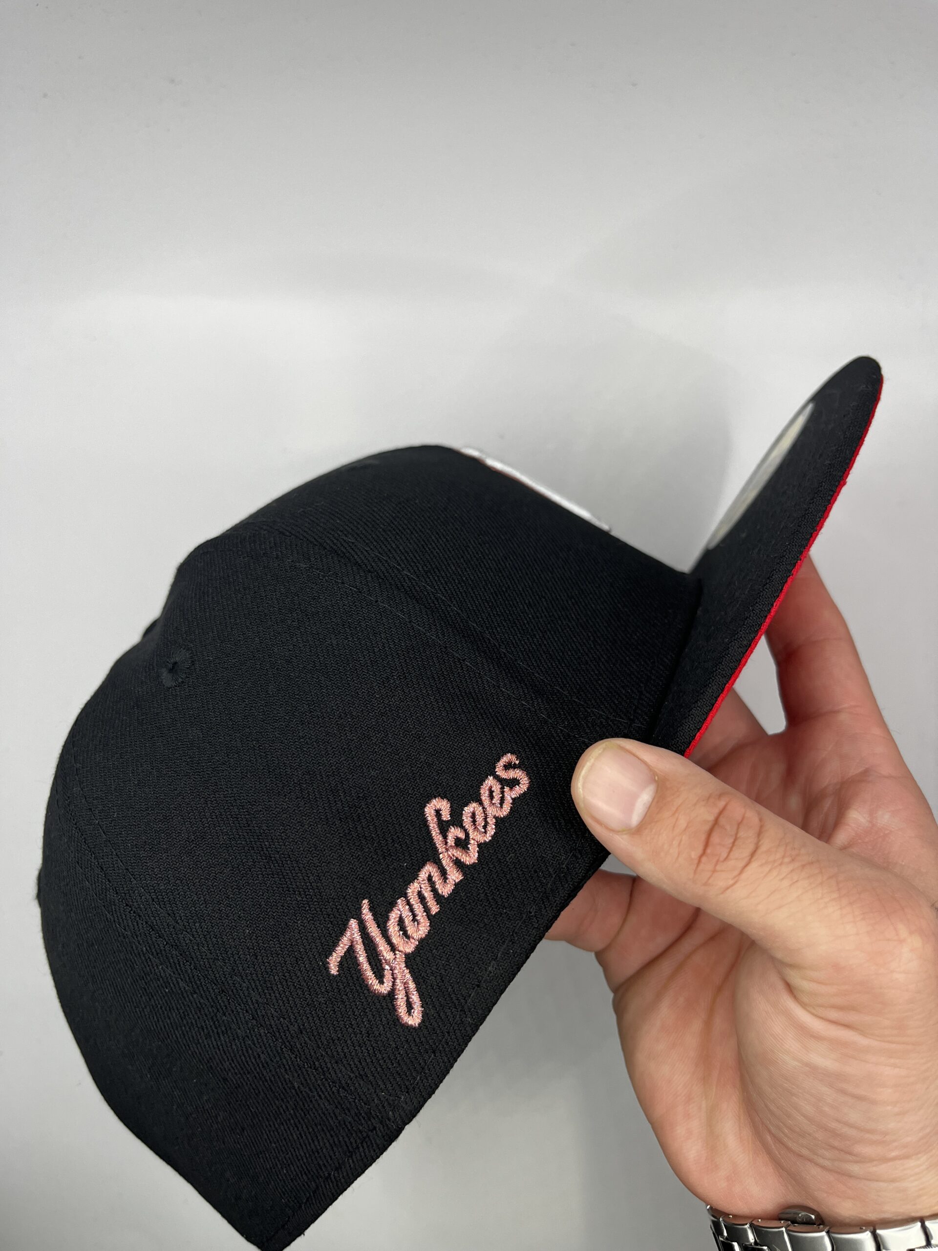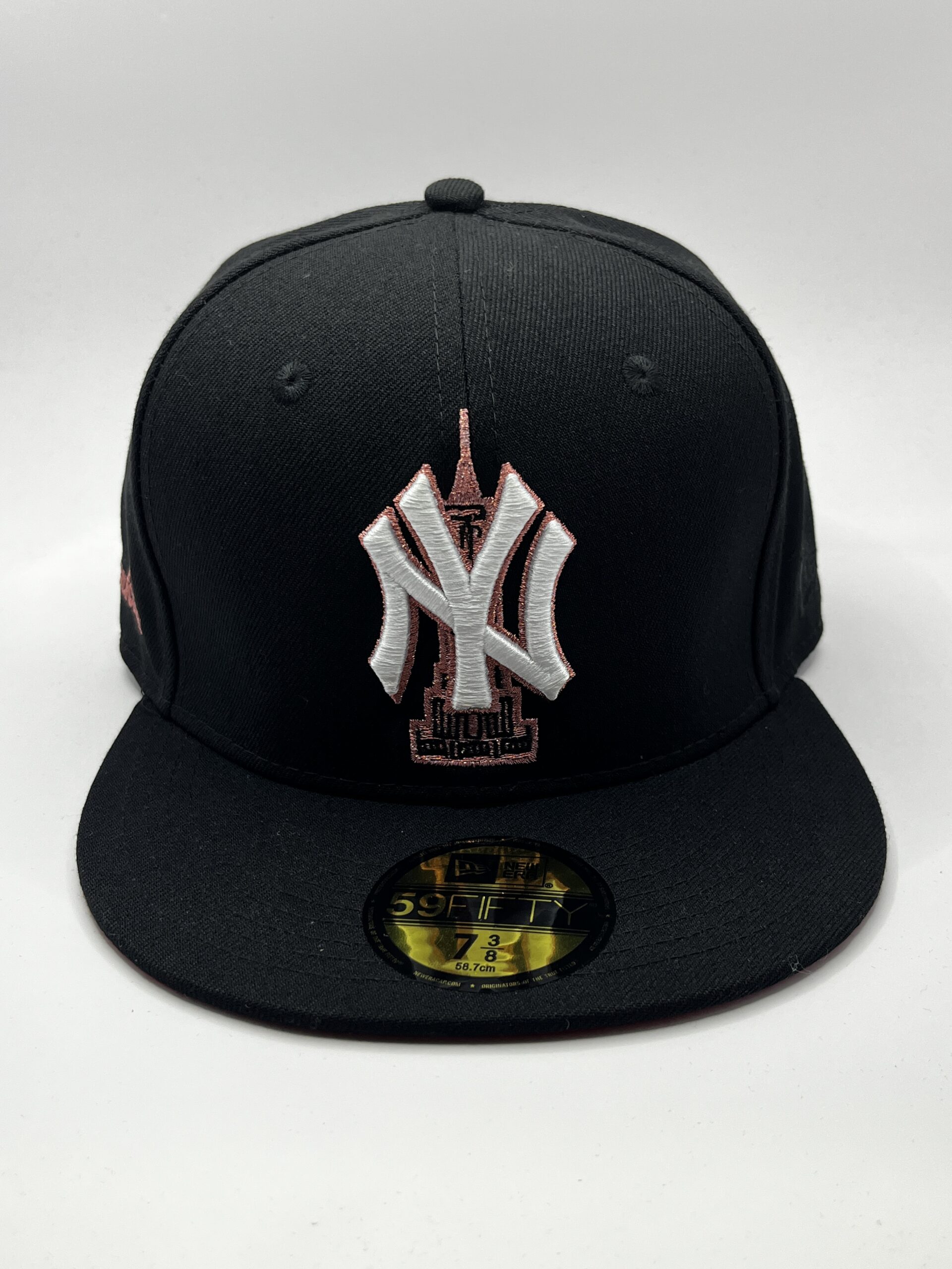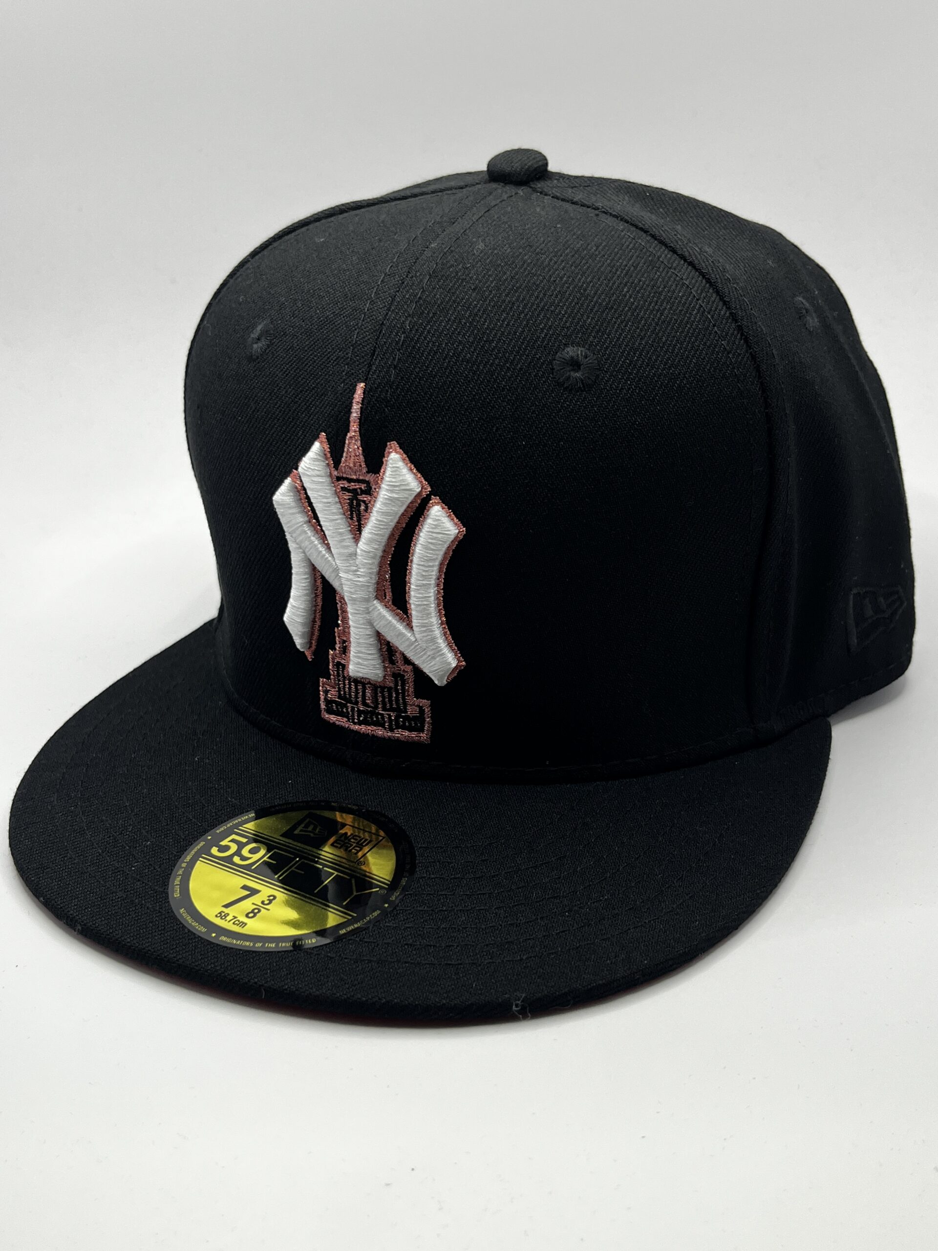 Diseño coleccionable que combina negro, blanco y cobre con un detalle icónico de Nueva York, ideal para fans de los Yankees y coleccionistas de gorras premium.