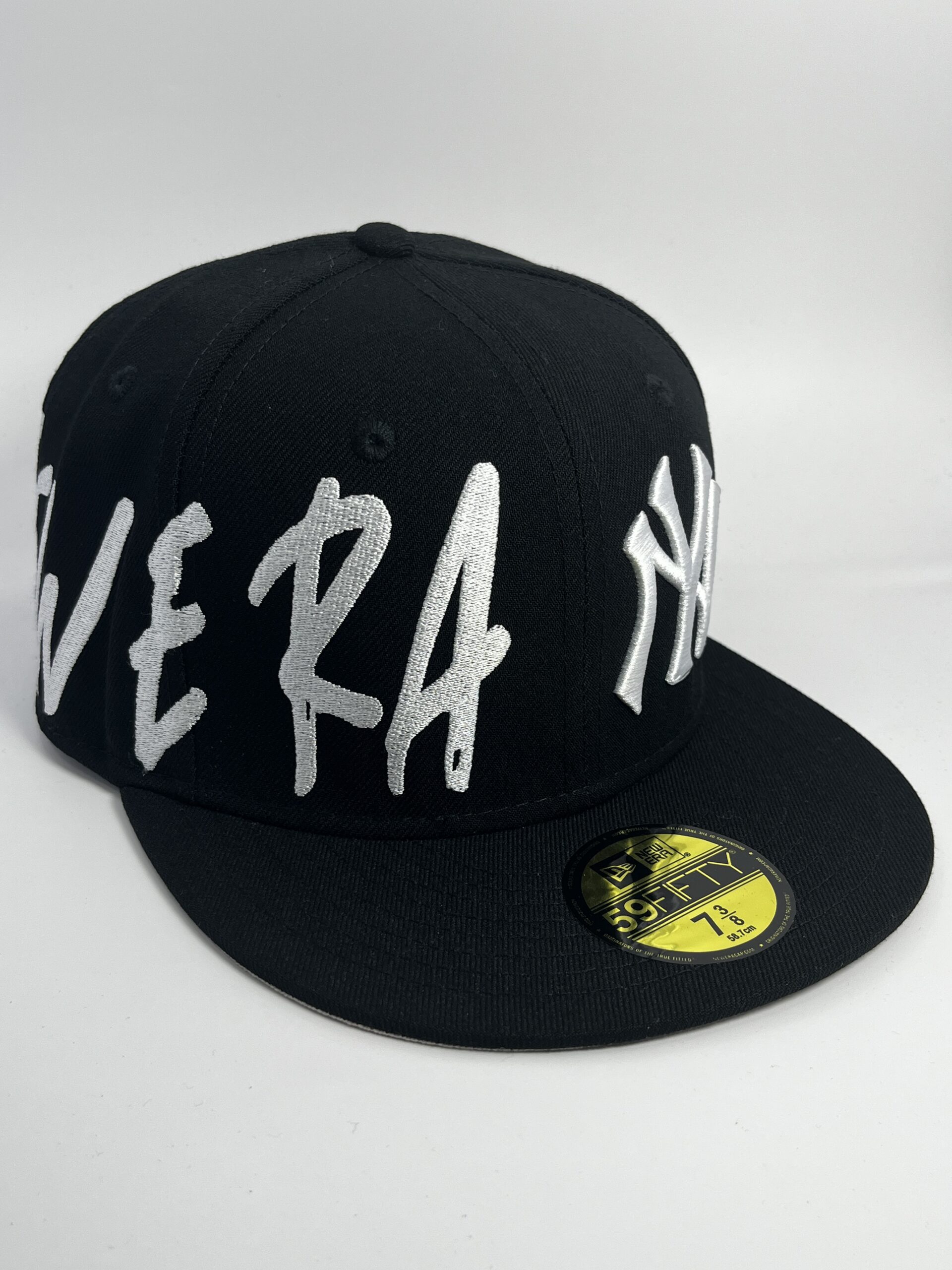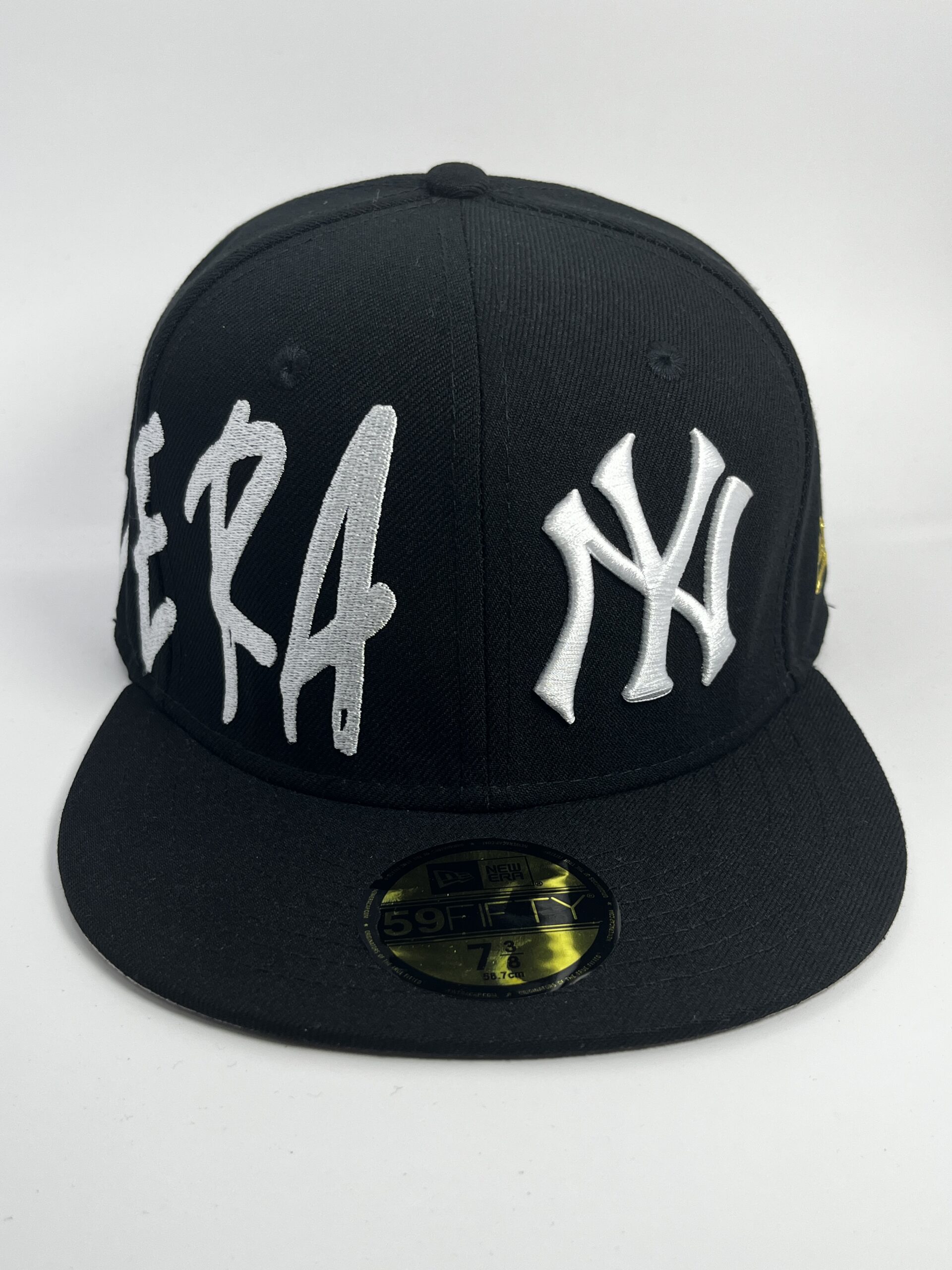 New Era 59FIFTY Yankees negra con letras blancas, talla 7 3/8 (58,7 cm), visera gris.