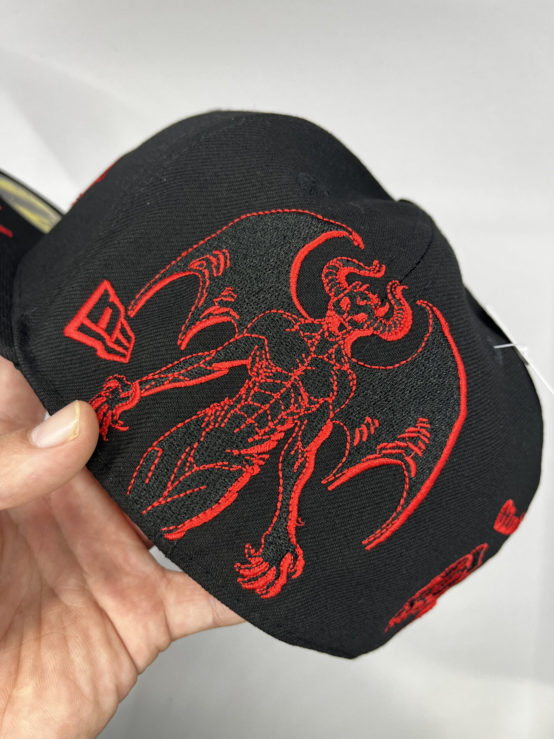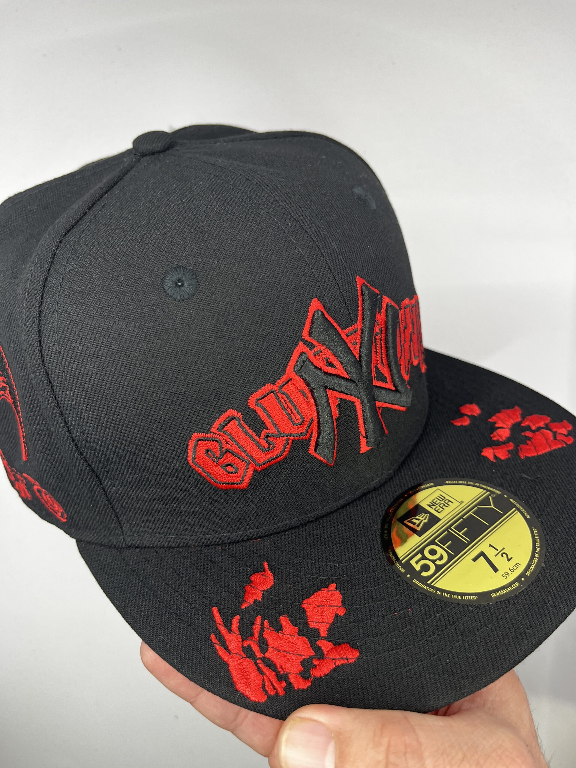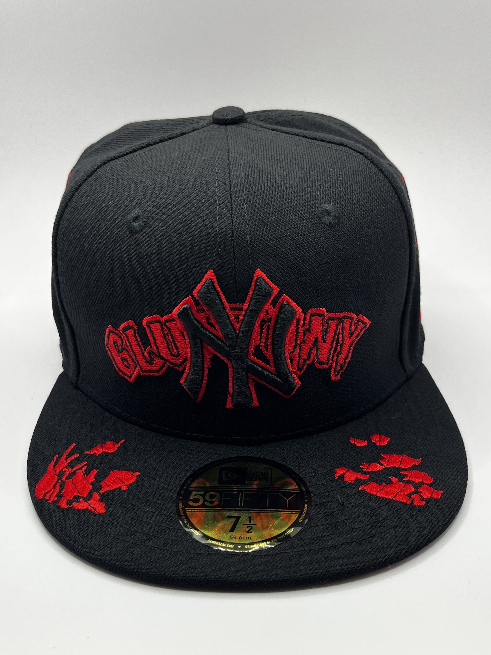 • Parche frontal: “NY” tejido en negro y bordado en hilo rojo