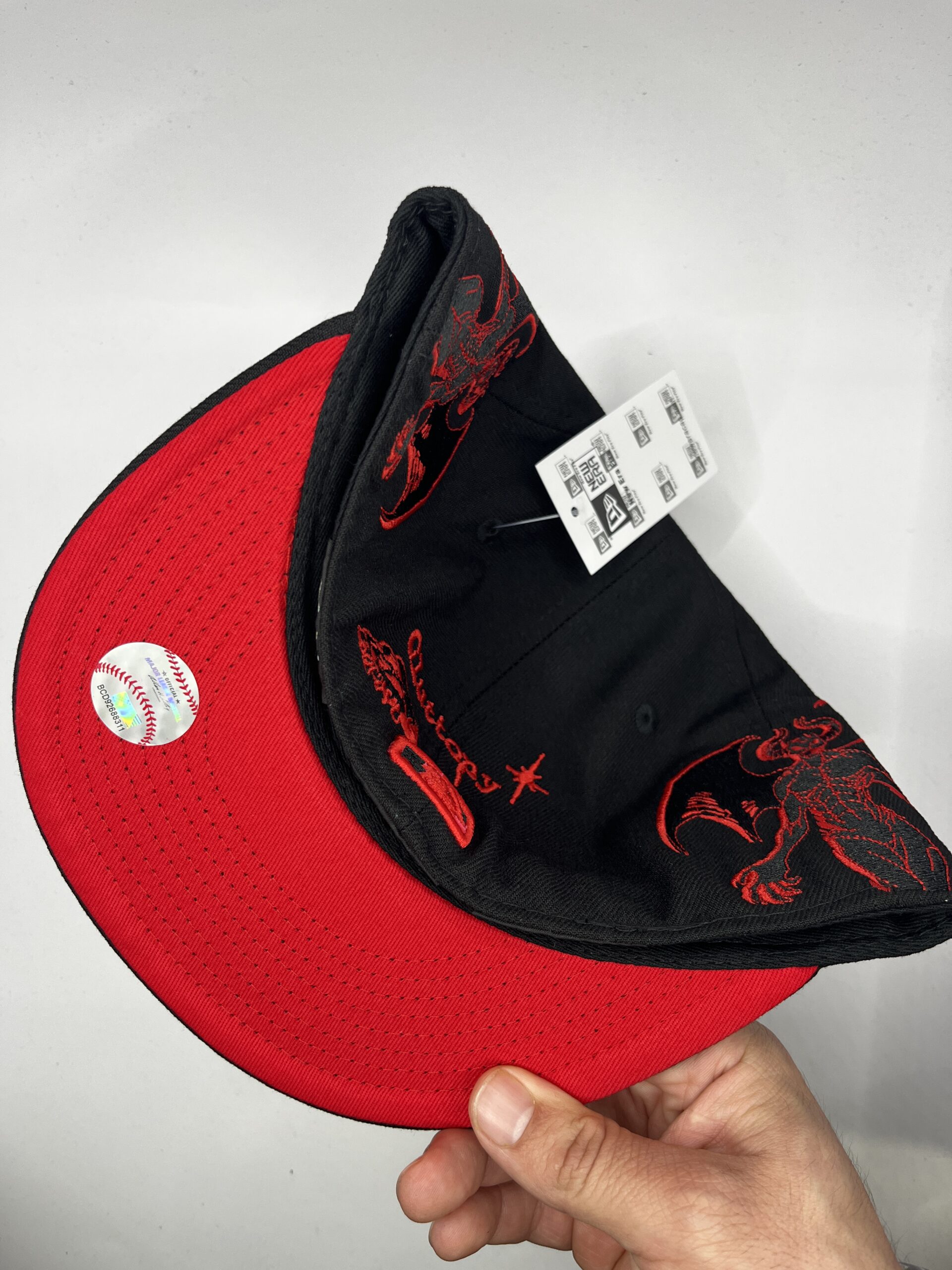 Diseño exclusivo con estética oscura en negro y rojo, ideal para coleccionistas y fans de los Yankees que buscan una pieza diferente y llamativa.