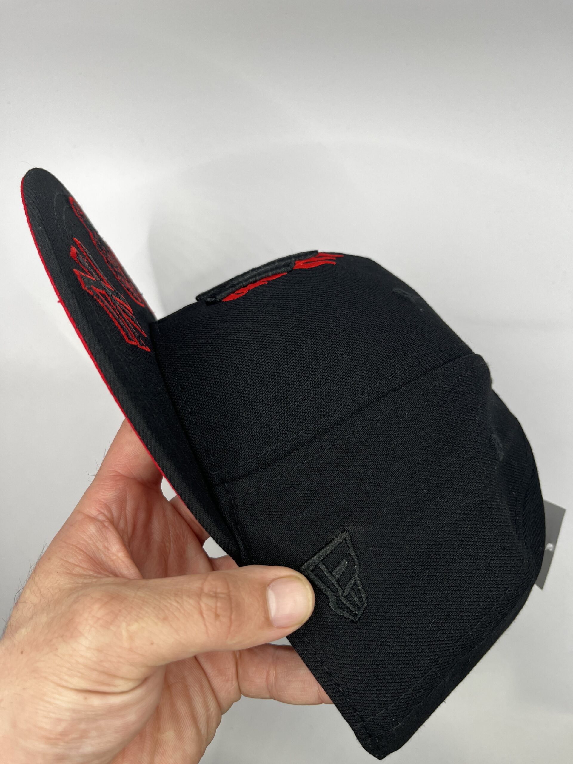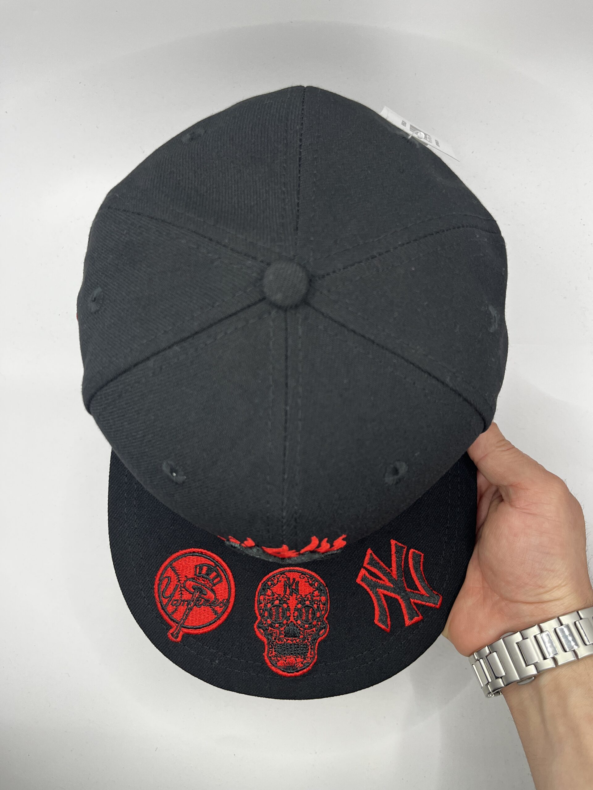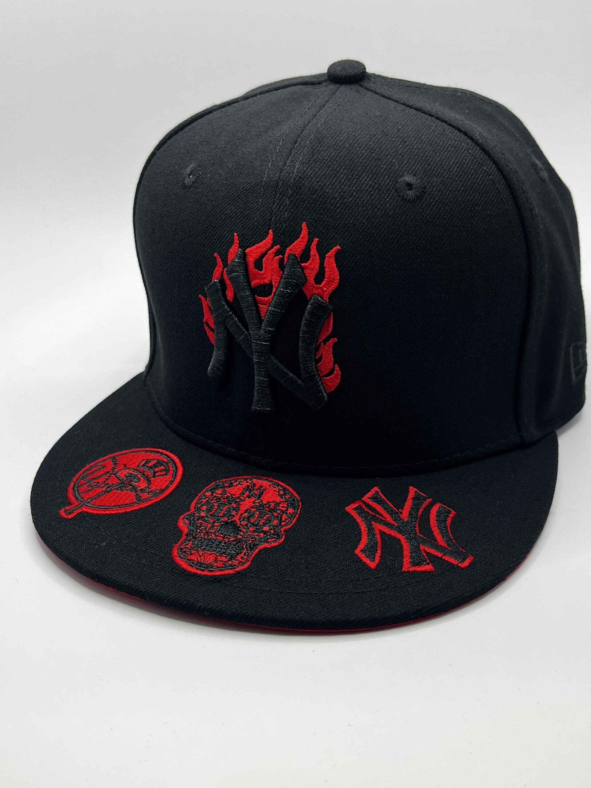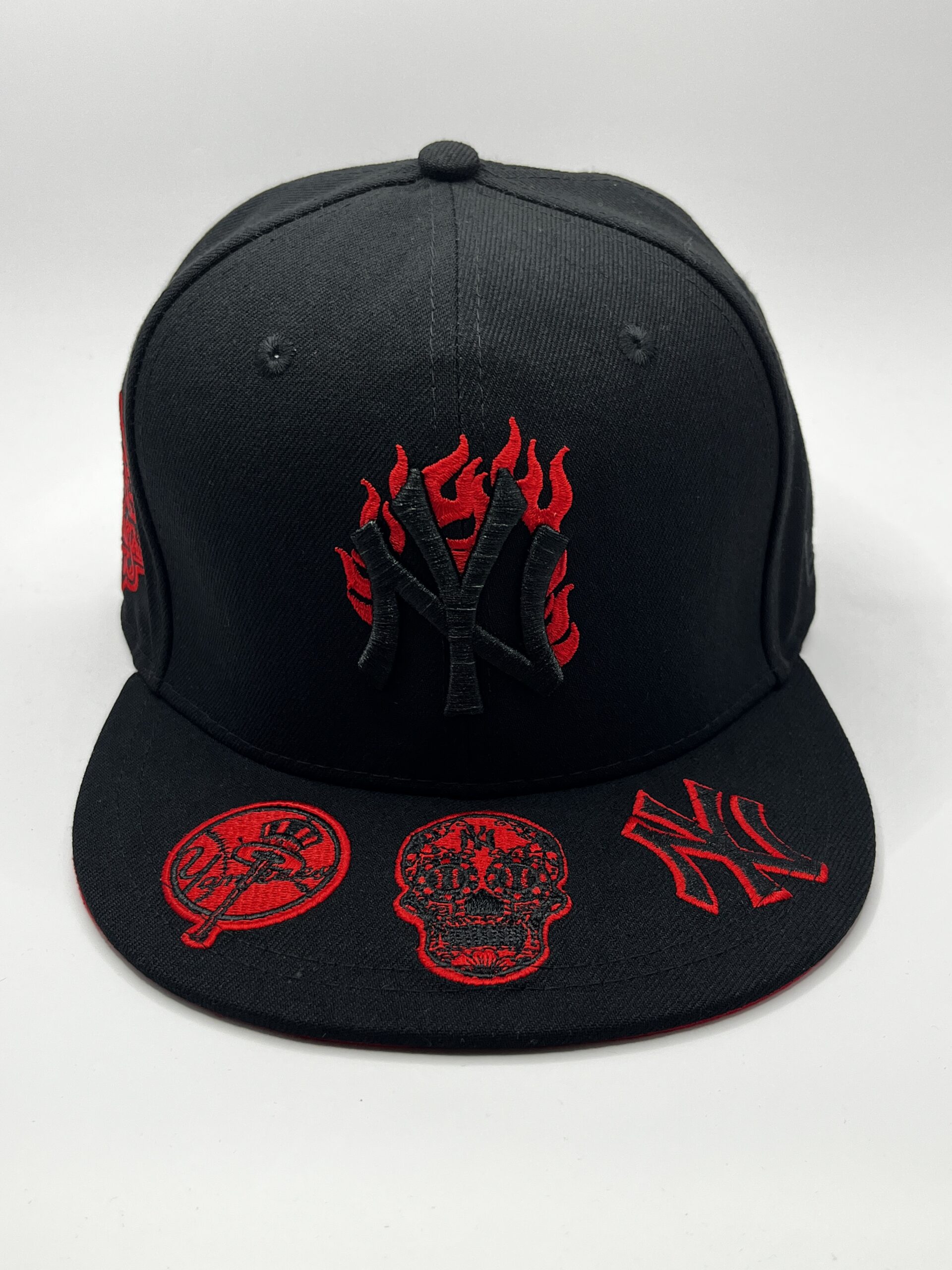 Diseño urbano y coleccionable que combina negro con rojo, llamas rojas y múltiples bordados, ideal para fans de los Yankees y ediciones premium de colección.