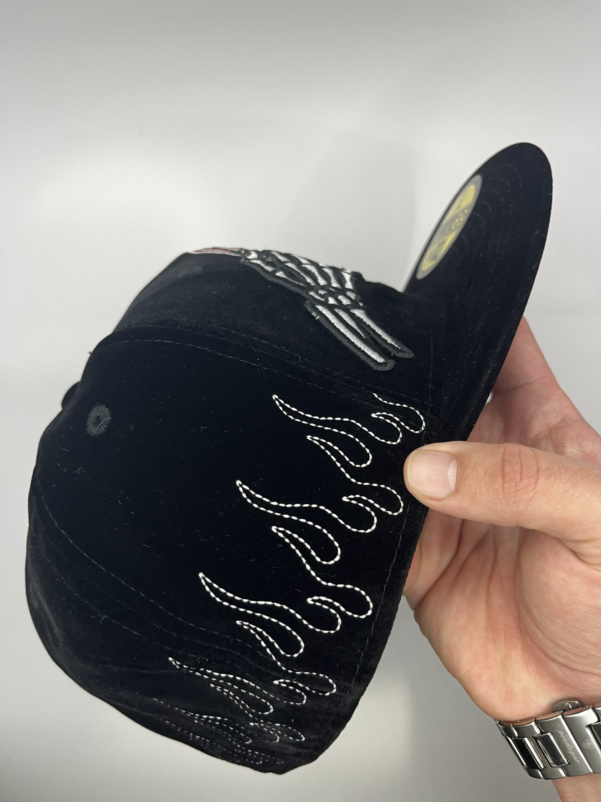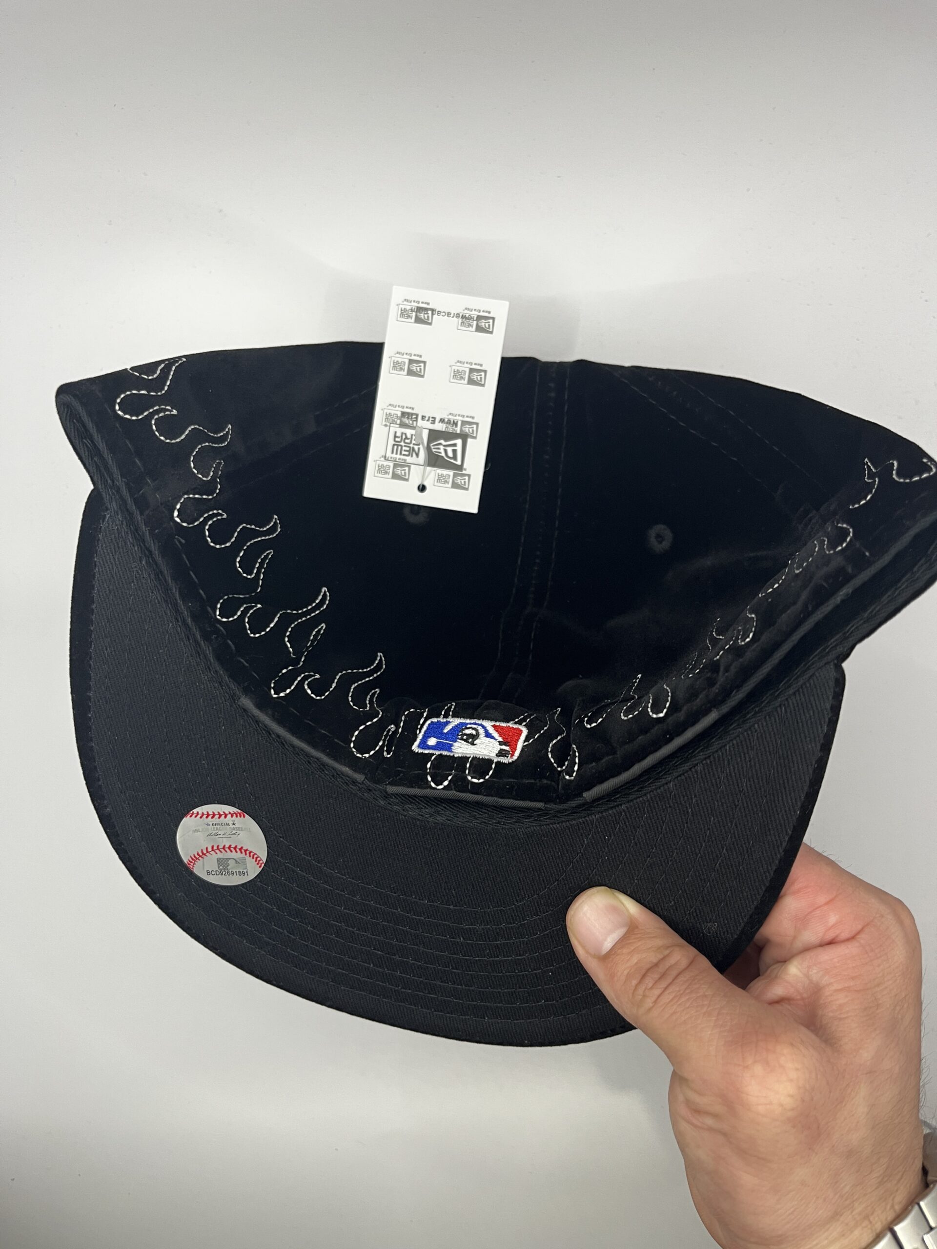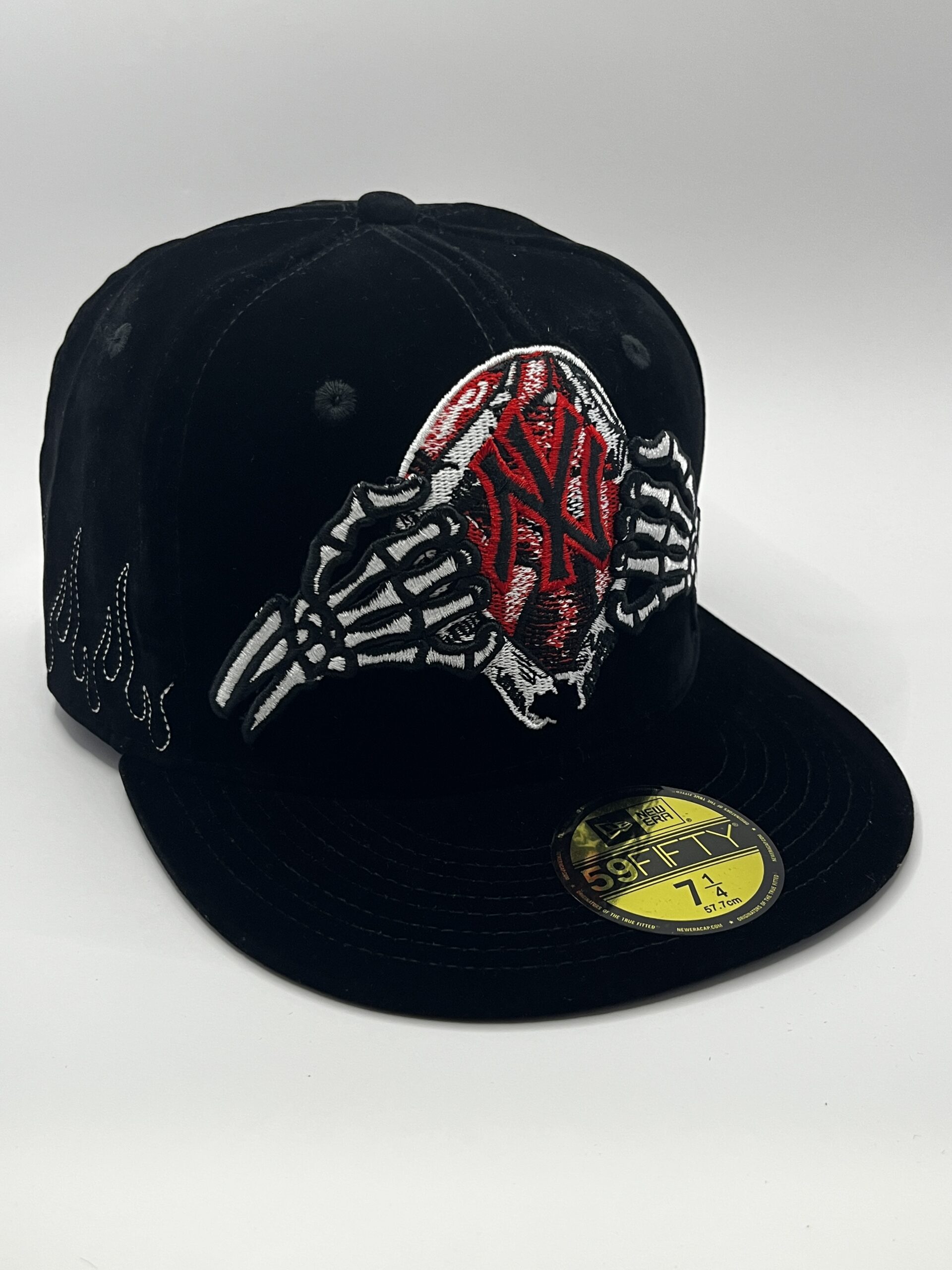 New Era 59FIFTY Yankees terciopelo negro con corazón esqueleto y llamas blancas, talla 7 1/4 (57,7 cm).